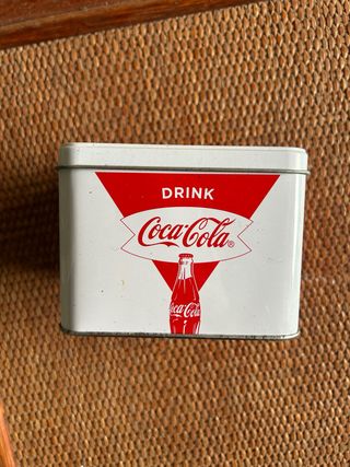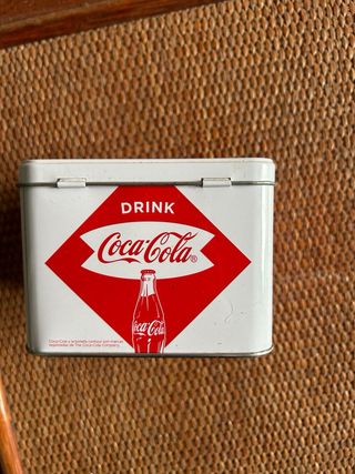 Caja de colección con diseño clásico de Coca-Cola. - Diseño frontal con logo y botella de Coca-Cola. - Color blanco con detalles en rojo. - Material metálico.