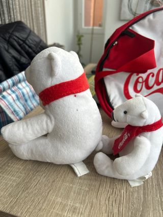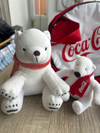 Adorable pareja de osos de peluche de Coca-Cola, perfectos para coleccionistas o fans de la marca. - Peluches de osos polares. - Incluyen bufandas rojas. - Diseño clásico de Coca-Cola. - El oso grande tiene la bufanda descolorida