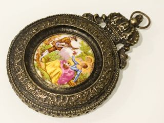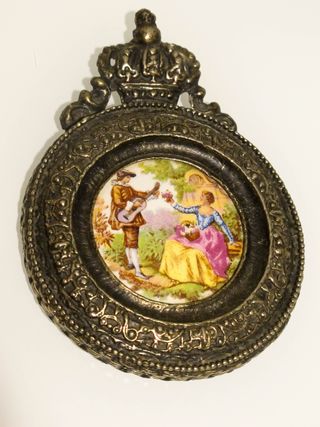 Medallón antiguo con una escena al estilo Fragonard. Presenta un marco ornamentado y un detalle de corona en la parte superior. - Diseño detallado. - Marco metálico de bronce con motivos victorianos S XIX-XX. - Imagen romántica de figuras y paisaje. - Camafeo probablemente de porcelana con una pintura esmaltada. Coleccionismo, antigüedad, decoración,... Muy buen estado. Mide 11cm x 8cm Preferible entrega en mano, otras opciones consultar.