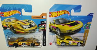 Dos autos Hot Wheels coleccionables. - Auto 1: Color dorado con detalles en rojo y negro, número 76. - Auto 2: Color amarillo con detalles en rosa y negro, número 95.
