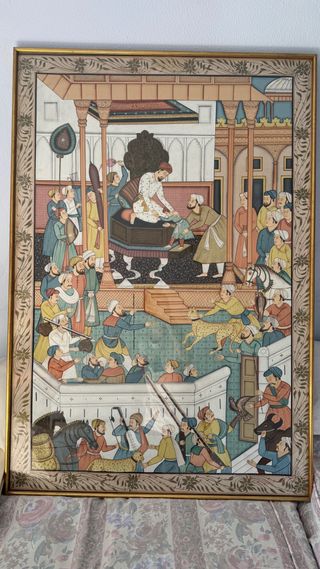 Este es un hermoso cuadro pintado a mano sobre seda, originario de la India. Representa una escena detallada con figuras humanas y animales. - Pintura sobre seda. - Origen: India. - Escena tradicional.
