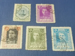 Conjunto de cinco sellos de colección de Persia. Cada sello presenta un retrato y un valor nominal. - Sello verde con valor 12 Ch. - Sello morado con valor 3R. - Sello naranja con valor 10R. - Sello verde con valor 2R. - Sello azul con valor 5R. A recoger en persona y pago en efectivo.