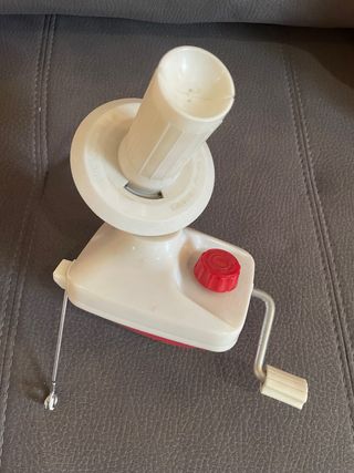 Enrollador de hilo manual para organizar tus ovillos de lana o hilo. - Mecanismo de manivela. - Base estable. - Color blanco y detalles en rojo.