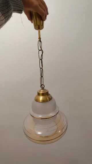 Elegante lámpara colgante de estilo vintage con detalles dorados. Su diseño único aporta un toque retro a cualquier espacio. - Acabado metálico en tono dorado. - Pantalla de cristal esmerilado y transparente con líneas doradas. - Cadena para colgar.