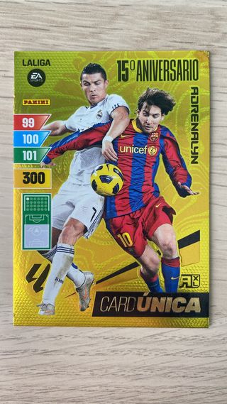 Carta coleccionable de La Liga, edición 15 Aniversario Adrenalyn. - Incluye los jugadores Cristiano Ronaldo y Lionel Messi. - Diseño especial con acabado brillante. - Puntuaciones: 99, 100, 101 y 300. -Num.470