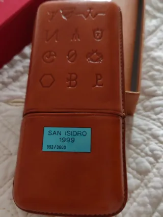 Elegante purera de cuero conmemorativa de la Feria de San Isidro 1999. Hecha a mano - Edición limitada. - Diseño grabado con símbolos de hierros de la tauromaquia. - Incluye número de serie 992/3000.