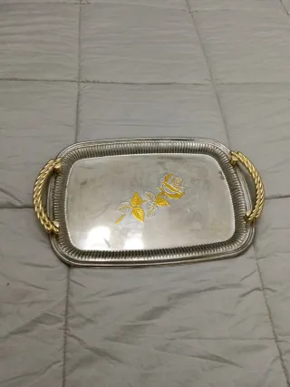 Elegante bandeja antigua con un diseño floral. - Decorada con una rosa amarilla y hojas. - Bordes con relieve. - Asas doradas trenzadas.