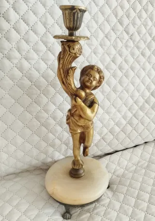 Precioso candelabro antiguo con figura de querubín. Bronce macizo. - Fabricado en bronce. - Base de mármol. - Diseño detallado.
