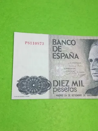 Billete de 10.000 pesetas del Banco de España, emitido en Madrid el 24 de septiembre de 1985. El billete muestra el retrato del Rey Juan Carlos I. - Serie P8110873. - Denominación: Diez Mil Pesetas. - Fecha de emisión: 24 de septiembre de 1985.