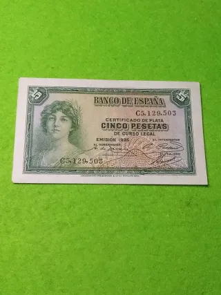 Billete de 5 pesetas del Banco de España, emisión de 1935. - Certificado de plata de curso legal. - Serie C5.129.503. - Impreso por Bradbury, Wilkinson & Co. Lda. Inglaterra.