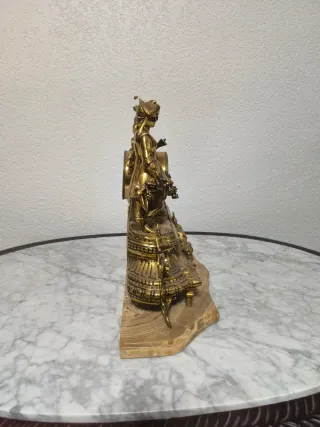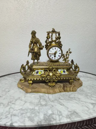 Elegante reloj de sobremesa con figura decorativa. - Base de bronce con detalles ornamentales. - Figura femenina con cesta. - Esfera de reloj con números romanos.