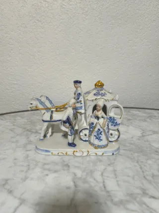 Preciosa figura de porcelana con un carruaje y dos personas. Ideal para coleccionistas o como elemento decorativo. - Diseño detallado en azul y blanco. - Acabados dorados. - Representa una escena clásica.