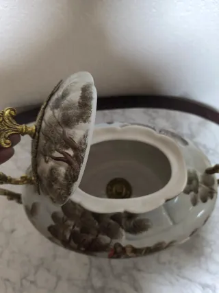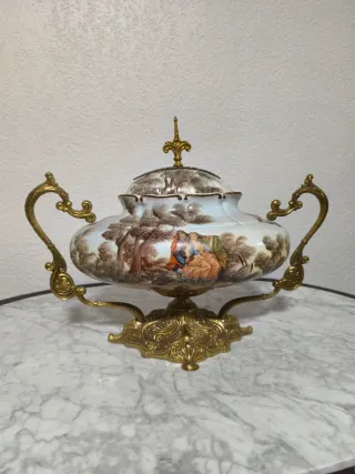 Elegante sopera antigua, perfecta como centro de mesa. Presenta una escena pintada a mano con detalles de paisaje y figuras. - Diseño con asas doradas. - Base ornamental dorada. - Tapa con remate decorativo.