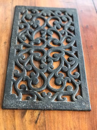 Rejilla ornamental de estilo antiguo, ideal para añadir un toque clásico a cualquier espacio. Su diseño intrincado la hace destacar. - Material: Hierro fundido. - Color: Negro. - Diseño: Estilo barroco con volutas. - Sin fisuras ni mellas.