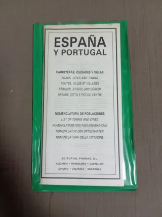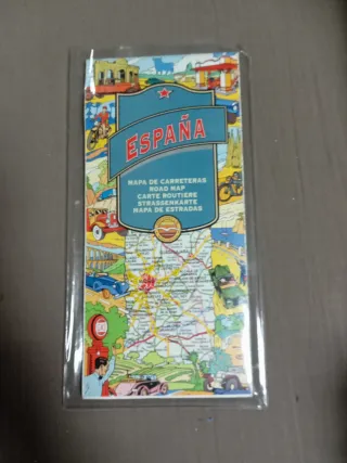 Mapa de carreteras de España, con un diseño vintage y colorido. - Ilustraciones de la época. - Múltiples idiomas: español, inglés, francés, alemán. - Ideal para coleccionistas o amantes de la historia.
