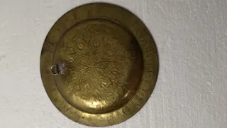 Precioso plato decorativo de latón con un diseño árabe. - Material: Latón. -Medidas: 19,5 cm de diámetro, fondo 12,5 cm, altura 2 cm. - Diseño intrincado. - Borde con motivos ornamentales. -Con pátina.