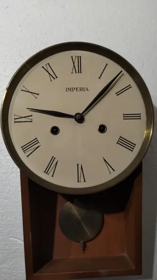 Reloj de pared con diseño clásico de la marca Imperia. Presenta una caja de madera y un péndulo. -Esfera 22cm de diámetro, altura con caja 35cm -Ignoro si funciona, no tiene la llave para darle cuerda, de ahí su precio. -Era parte de un diseño decorativo, parece conservar todas sus piezas. - Esfera con números romanos. - Péndulo dorado. - Caja de madera.