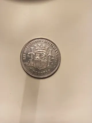 Moneda conmemorativa de Alfonso Xlll, acuñada en 1888. - Diseño detallado del perfil del rey. - Inscripción ALFONSO XIII en el borde. 5 pesetas