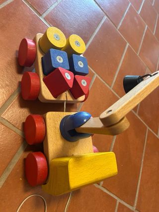 Este es un juguete antiguo de coleccionista, hecho de madera. - Incluye bloques de construcción de diferentes formas y colores. - Tiene una grúa con un peso. - Cuenta con ruedas rojas y un tirador de cuerda.
