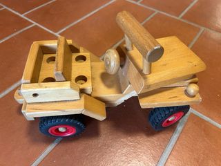 Este es un juguete antiguo hecho de madera. - Material: Madera natural. - Diseño: Estilo clásico de vehículo. - Acabado: Superficie lisa y pulida.