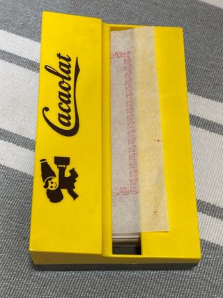 Servilletero vintage de Cacaolat, ideal tanto para coleccionistas como para uso casual y seguidores de la marca debido a la conservación de sus servilletas originales. Se encuentra en un estado excelente, como nuevo, sin ningún rasguño ni señal de desgaste, con una gran cantidad de servilletas mencionadas anteriormente y un diseño impecable. Conserva la estética de Cacaolat de los años 70, con su logotipo antiguo incluido en el frente y sus colores míticos amarillo y marrón.