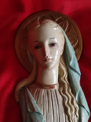 Busto de la Virgen María con halo. - Figura religiosa decorativa. - Base de madera y detalles en color azul y rosa.