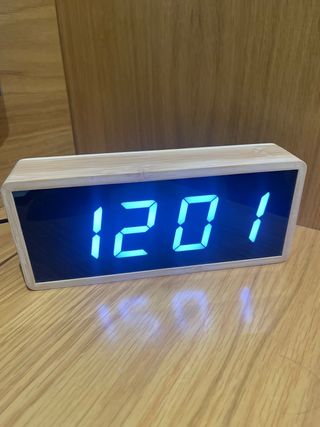 Elegante reloj despertador con acabado en madera natural. Su diseño moderno y minimalista se adapta a cualquier espacio. - Pantalla LED azul. - Material: Madera.