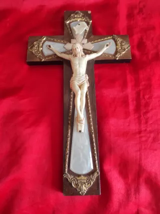Precioso crucifijo de pared con figura de Cristo. - Base de madera oscura. - Figura de Cristo en resina color marfil. - Detalles decorativos dorados. - Inserciones nacaradas en los brazos y base de la cruz.