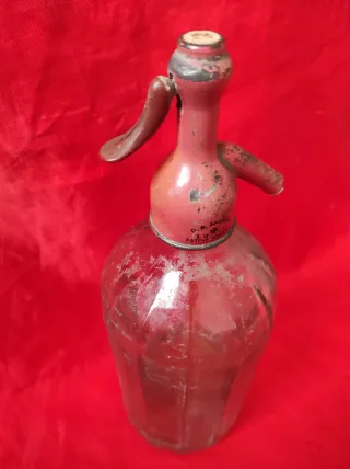 Sifón antiguo de vidrio y metal con detalles de la marca D.G. SANDU. - Diseño clásico. - Mecanismo de palanca. - Ideal para coleccionistas.