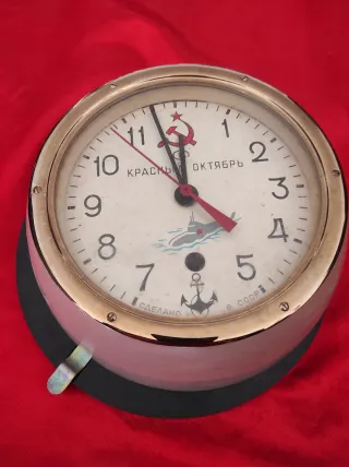 Reloj de sobremesa de fabricación rusa, modelo Krasny Oktyabr (Octubre Rojo). Presenta un diseño distintivo con motivos marinos. - Esfera blanca con números arábigos. - Imagen de un submarino y un ancla. - Sello Сделано в СССР (Hecho en la URSS). Funcionamiento correcto.