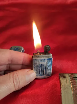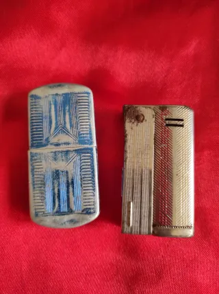 Conjunto de dos mecheros antiguos con un diseño clásico. - Un mechero plateado con detalles grabados. - Otro mechero con acabado azul y detalles geométricos.