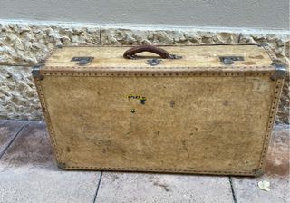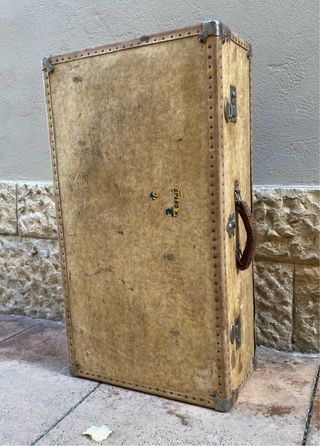 Maleta antigua con un diseño clásico y robusto. Perfecta para decoración o coleccionistas. - Material exterior resistente. - Detalle de remaches metálicos en los bordes. - Asa superior de cuero. - Cierres metálicos frontales.