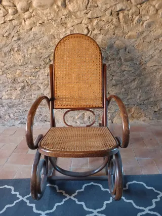 Este sillón antiguo, hecho a mano, combina la calidez de la madera con la textura natural del ratán. - Estructura de madera. - Asiento y respaldo de ratán tejido.