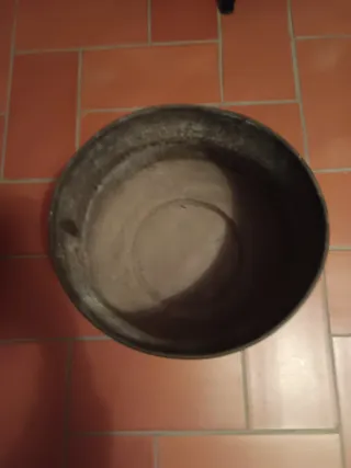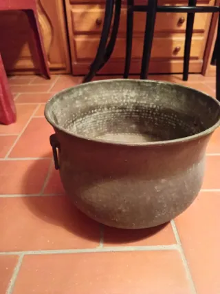 Olla de cobre antigua, ideal para decoración o coleccionismo. Su diseño rústico le da un toque especial. - Material: Cobre. - Asas laterales para facilitar su manejo.