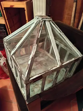 Precioso invernadero de cristal con estructura de madera. Se puede negociar precio. Ideal para decorar y cuidar plantas. Necesita restauración. - Diseño clásico con techo a dos aguas. - Marco de madera con pintura desgastada.