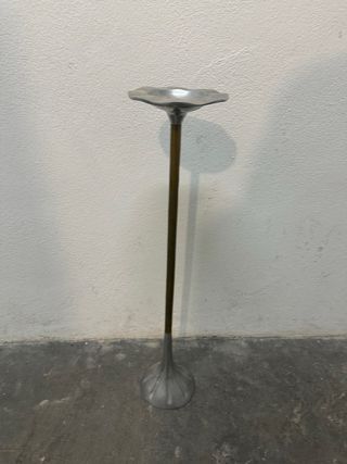 Elegante cenicero de pie con un diseño moderno y funcional. Su estructura metálica le confiere durabilidad y un acabado sofisticado. - Base ancha y estable. - Columna alta y esbelta. - Plato superior con forma. - Material: aluminio y latón