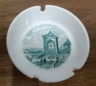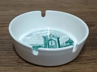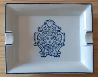 Cenicero de porcelana con un diseño clásico de La Cartuja de Sevilla. - Diseño con escena paisajística y embarcación. - Color blanco con detalles en marrón. - Borde con muescas para cigarrillos.