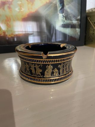 Elegante cenicero de cerámica con un diseño inspirado en la antigua Grecia. Presenta una escena decorativa en relieve con figuras doradas sobre fondo azul oscuro. Fue comprada en Atenas a mediados de los años 80. Pintada con detalles con polvo de oro 24k. - Material: Cerámica. - Diseño: Figuras griegas doradas. - Color: Azul oscuro y dorado.