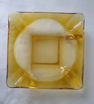 Cenicero de cristal con un bonito color ámbar y forma cuadrada. - Diseño con cuatro muescas para apoyar cigarrillos. - Superficie lisa y brillante.años 80