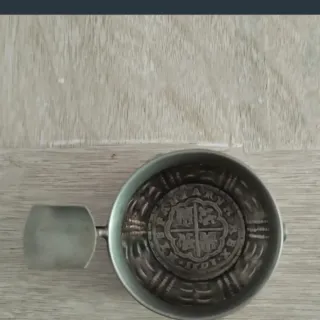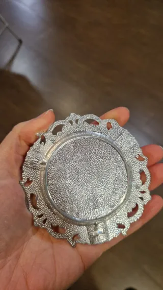 Cenicero de alpaca con un diseño intrincado y un asa lateral. - Fabricado en alpaca. - Diseño grabado en el interior. - Asa lateral para facilitar su manejo.
