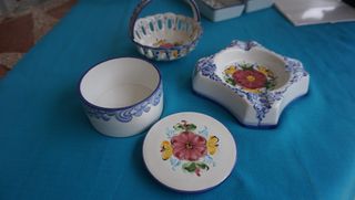 Conjunto de tres piezas de cerámica artesanal con un diseño floral pintado a mano. Medidas cenicero 13x13x4 cm, cesto 12,5 cm diametro y 11 cm alto, joyero 10 cm diametro y 5,5 cm alto, perfecto estado, muy bonito - Incluye una caja redonda con tapa. -Un cenicero - Un cuenco con asa y detalles calados. 12,5 euros Tambien Elegante cenicero de cristal tallado con un diseño intrincado. - Material: Cristal. - Medidas: 14x14 cm y 4,5 cm alto - Diseño tallado. Precio cenicero cristal 12,5 euros, hago envios, tengo mas cosas a la venta, mirar mi perfil, gracias