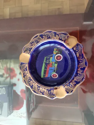 Elegante cenicero de porcelana con un diseño vintage. - Color azul profundo. - Detalle dorado en el borde. - Ilustración de un coche antiguo en el centro. -Venta en persona. -Mide 13 cm.