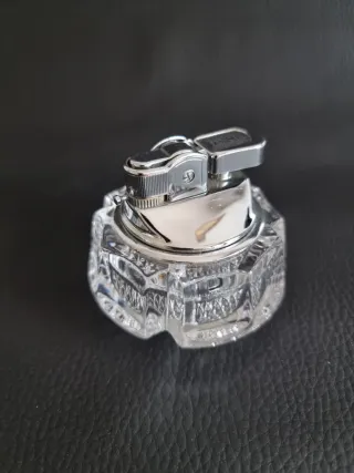 Elegante cenicero de estilo vintage, una pieza decorativa con un toque retro. - Cuerpo de cristal con diseño facetado. - Aro superior de metal cromado. - Bola decorativa de cristal en la tapa.