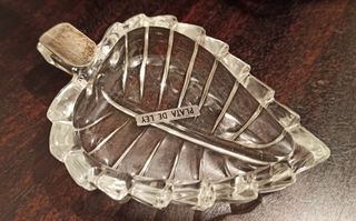 Cenicero con forma de hoja, fabricado en cristal tallado. Cuenta con un detalle de plata de ley en el tallo. Nuevo a estrenar. - Diseño en forma de hoja. - Material: Cristal y plata de ley. - Etiqueta PLATA DE LEY visible. - Medidas: 11cm de largo de tallo a punta, 8cm en la zona más ancha y 1,5cm de grosor