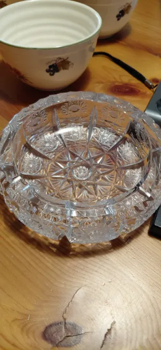 Elegante cenicero de cristal tallado, con el distintivo diseño de Bohemia. Unos 15 centímetros de diámetro. - Material: Cristal. - Diseño intrincado y detallado. - Borde decorado.