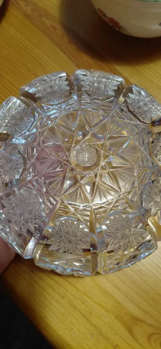 Elegante cenicero de cristal tallado con diseño intrincado. - Material: Cristal de Bohemia. - Diseño: Tallado con motivos geométricos y estrellas. - Forma: Redonda con borde festoneado.