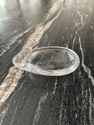 Elegante cenicero ovalado de cristal pesado de la marca Sèvres Francia. - Diseño moderno y sofisticado. - Material: Cristal. - Forma: Ovalada. - El cenicero es de los años 60-70, tiene leves marcas en su base debido al transcurso del paso del tiempo. - Medidas: 16x10x3,5 cms.
