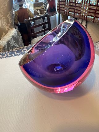 Elegante cenicero de cristal Murano con técnica Sommerso. Su diseño geométrico y los colores vibrantes lo convierten en una pieza decorativa. La pieza es redonda y profunda, con una hendidura en la parte superior; está inclinada, lo que aumenta su atractivo visual. - Técnica de vidrio soplado Sommerso. - Tonos morados, azules y rosados. - Estilo Mid-Century Modern. 9 cm de altura 10 cm de diámetro