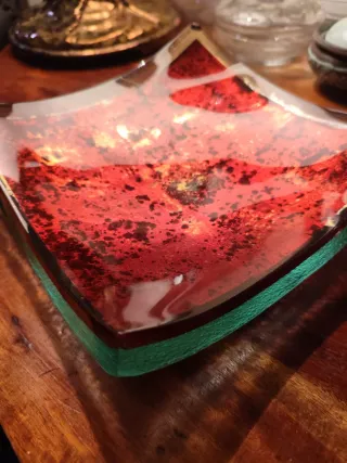 un cuenco o cenicero decorativo quizás de cristal de Murano, posiblemente de Barovier & Toso. Es una pieza única de colección hecha a mano por expertos maestros del vidrio. Conocido por sus colores vibrantes e intensos, este ejemplar presenta un llamativo diseño rojo con motas doradas y una base de cristal turquesa. Tiene las esquinas tocadas un de ellas le falta un pedazo se ve en fotografías 21*21 cm