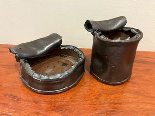 Conjunto de dos latas de cerámica con un diseño único y artesanal. Medidas: - Lata de la izquierda: 6cm (alto), 14cm (Ø). - Lata de la derecha: 11,50cm (alto), 10cm (Ø) No solo son piezas decorativas, pueden ser utilizadas como cenicero, cuenco, cubilete para lápices, etc.